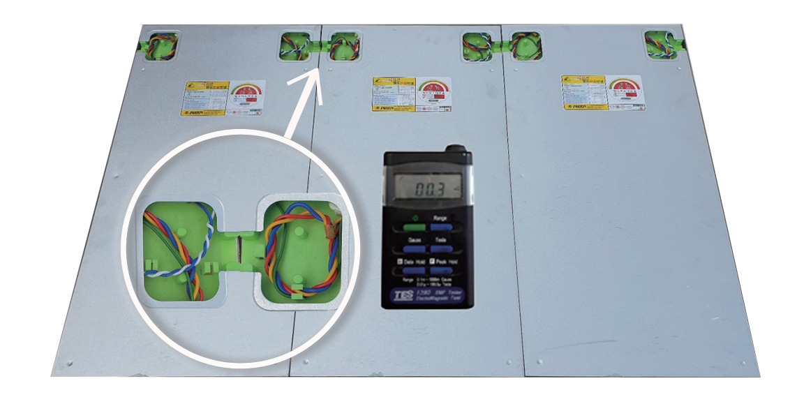 - 전자파란 전계와 자계로 구분되며, 전계는 접지(어스)를 통하여 차단할 수 있으나 자계쪽은 그동안 방치되어 오던 중, 특허 등록된 무자계열선을 사용한 획기적인 제조공법을 도입 안전하게 차단하였습니다.